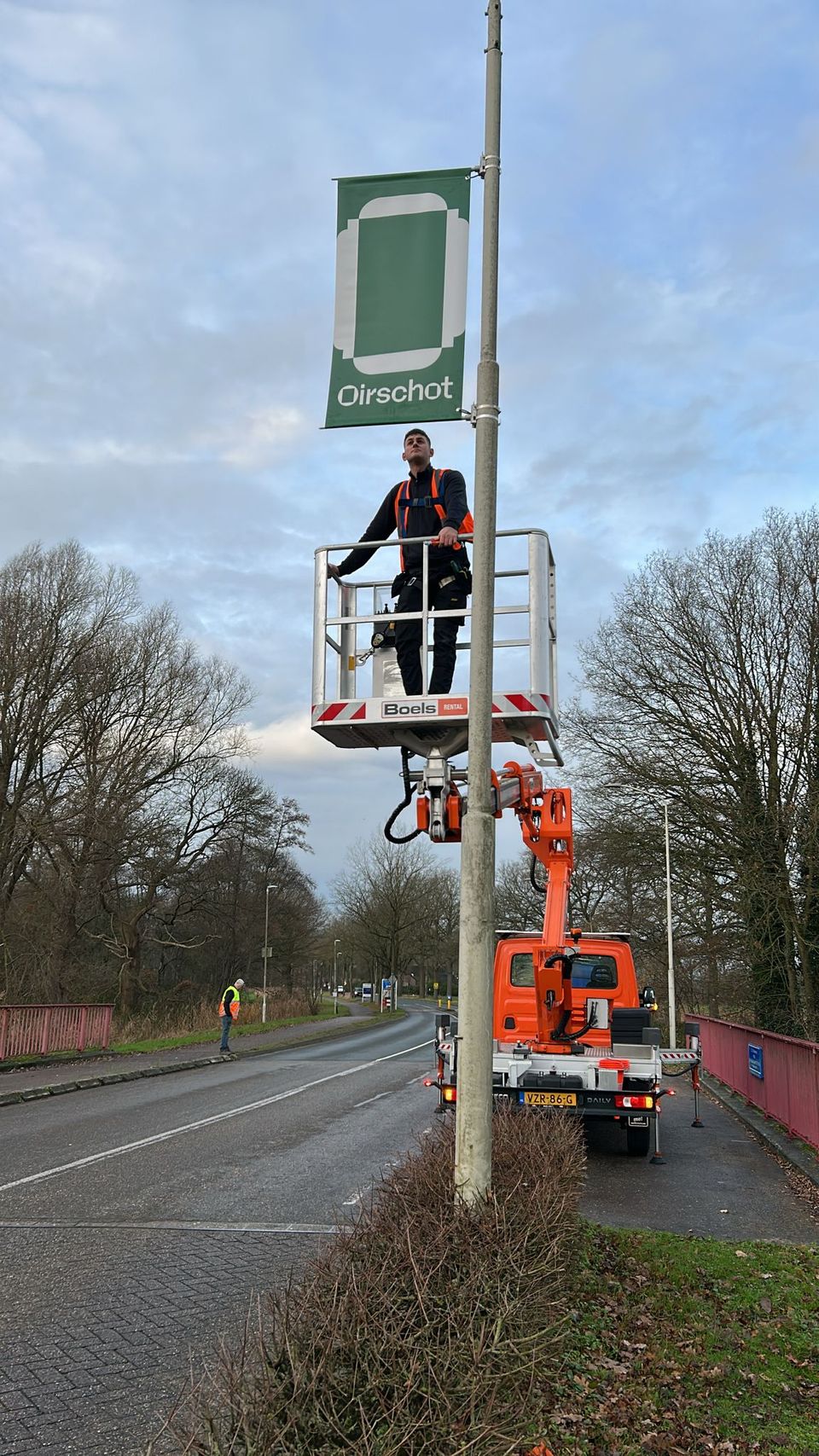 - De afghaalde banieren (Oirschot logo) worden door de vereniging zelf droog, schoon en kreukvrij opgeborgen en ook weer terug gehangen, identiek aan de situatie voor omwisseling. Gelieve ook bij terugplaatsing letten op de kleuren (niet dezelfde kleuren bij elkaar). Let op: bij voorkeur niet te strak oprollen. Bij het vervangen van de banners kan het zijn dat het systeem bijgesteld moet worden, aangezien de banners qua formaat iets kunnen afwijken. Graag vooraf in overleg met Brunschot.