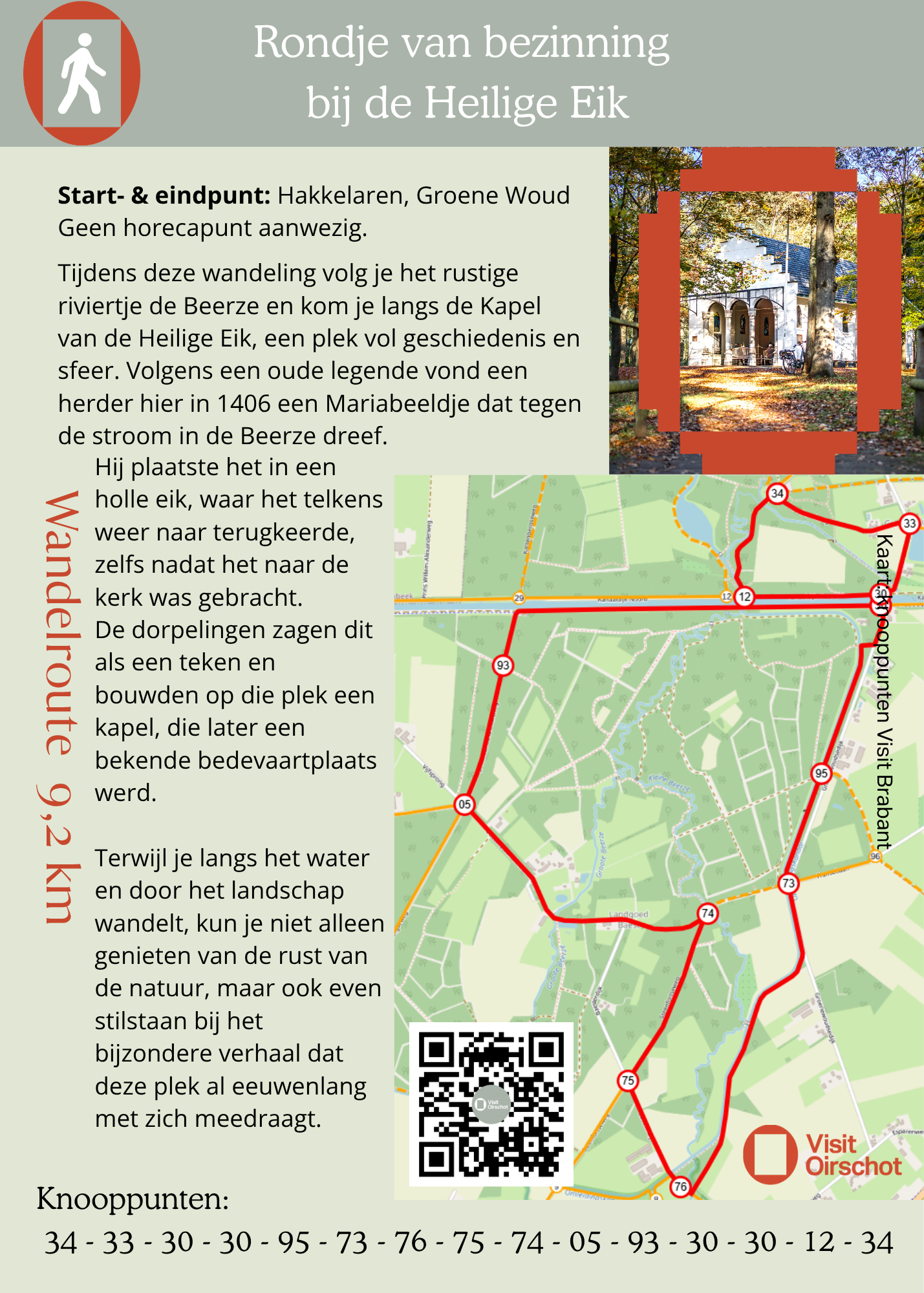 Tijdens deze wandeling volg je het rustige riviertje de Beerze en kom je langs de Kapel van de Heilige Eik, een plek vol geschiedenis en sfeer. Volgens een oude legende vond een herder hier in 1406 een Mariabeeldje dat tegen de stroom in de Beerze dreef. Hij plaatste het in een holle eik, waar het telkens weer naar terugkeerde, zelfs nadat het naar de kerk was gebracht. De dorpelingen zagen dit als een teken en bouwden op die plek een kapel, die later een bekende bedevaartplaats werd. Terwijl je langs het water en door het landschap wandelt, kun je niet alleen genieten van de rust van de natuur, maar ook even stilstaan bij het bijzondere verhaal dat deze plek al eeuwenlang met zich meedraagt.